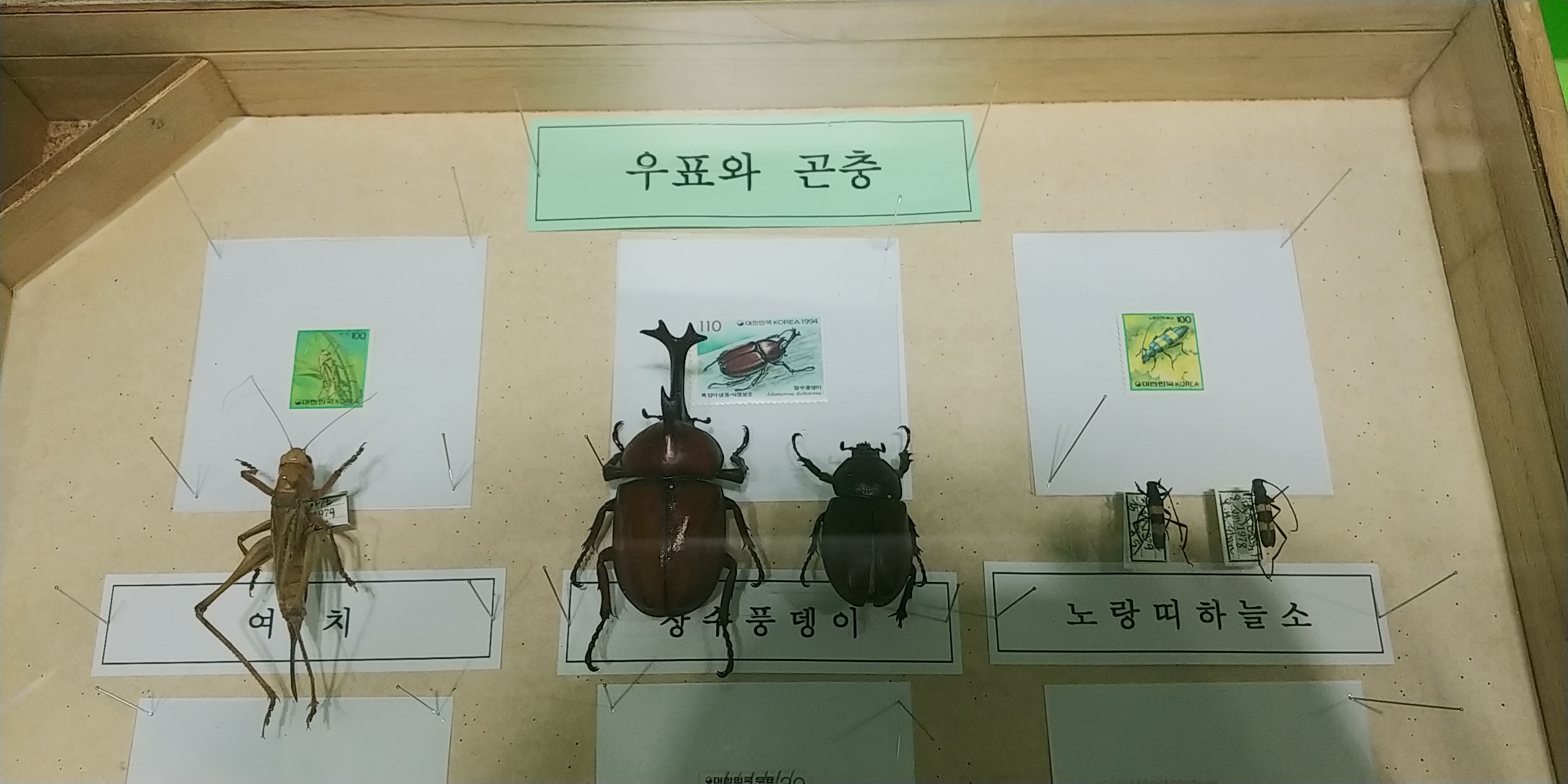 예전에는 곤충우표가 있었는데 여치,장수풍뎅이,노랑띠하늘소 등이 보입니다.
