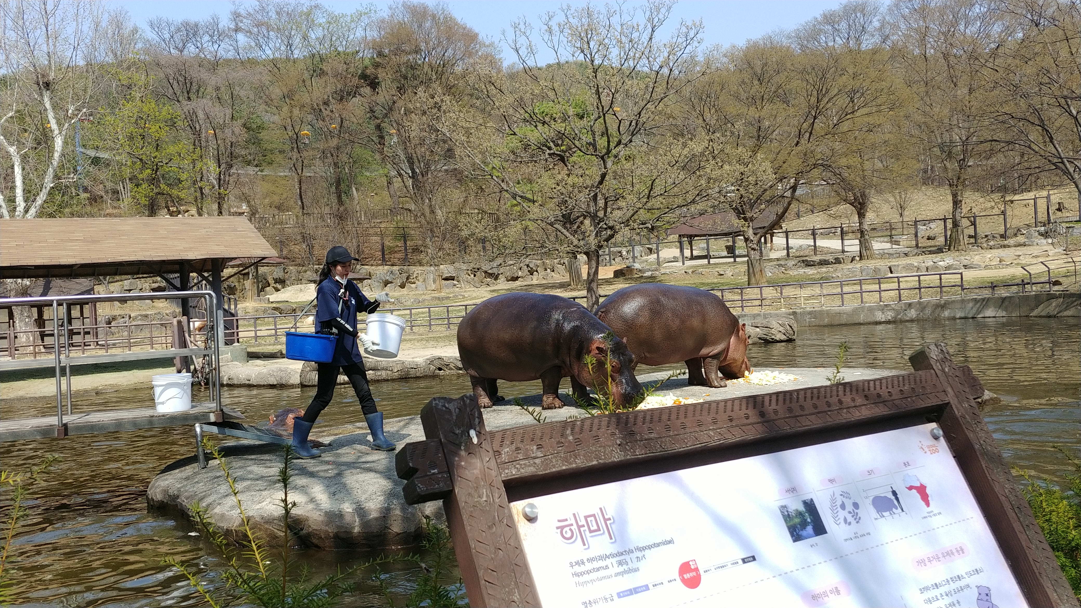 하마 사료를 사육사님이 주면서 마이크로 안내설명방송을 들으면서 구경하는 행운을 잡았습니다.