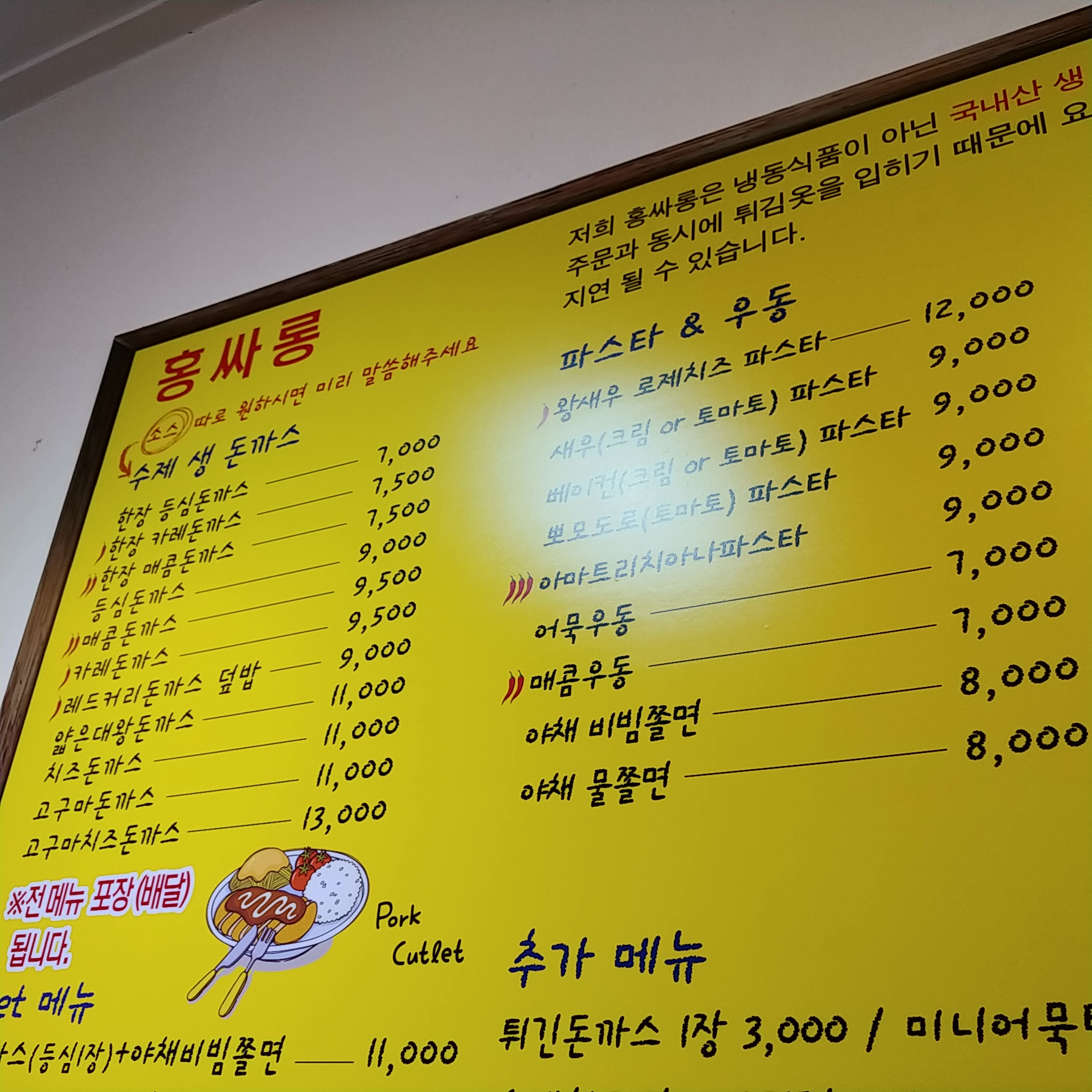 엥 간판이 홍싸롱 맞네요 그리고 아래 수제매콤톤까스 &파스타 적혀있어요.