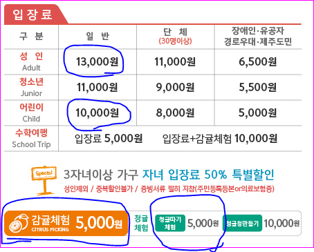 결론부터 말하면 입장료 13000 어린이 10000인데 감귤체험비 5천원인데
