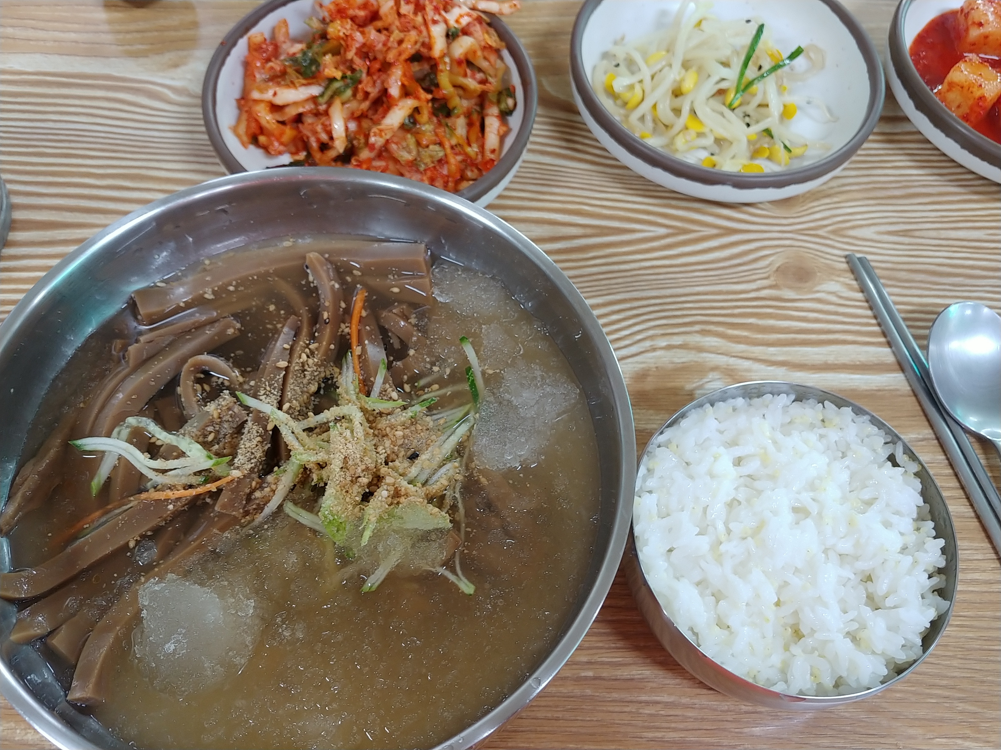 밥이 묵밥에 말아서 먹는데 잘 풀리지 않아서 밥을 약간 덜 찰지게 했으면 좋겠다.