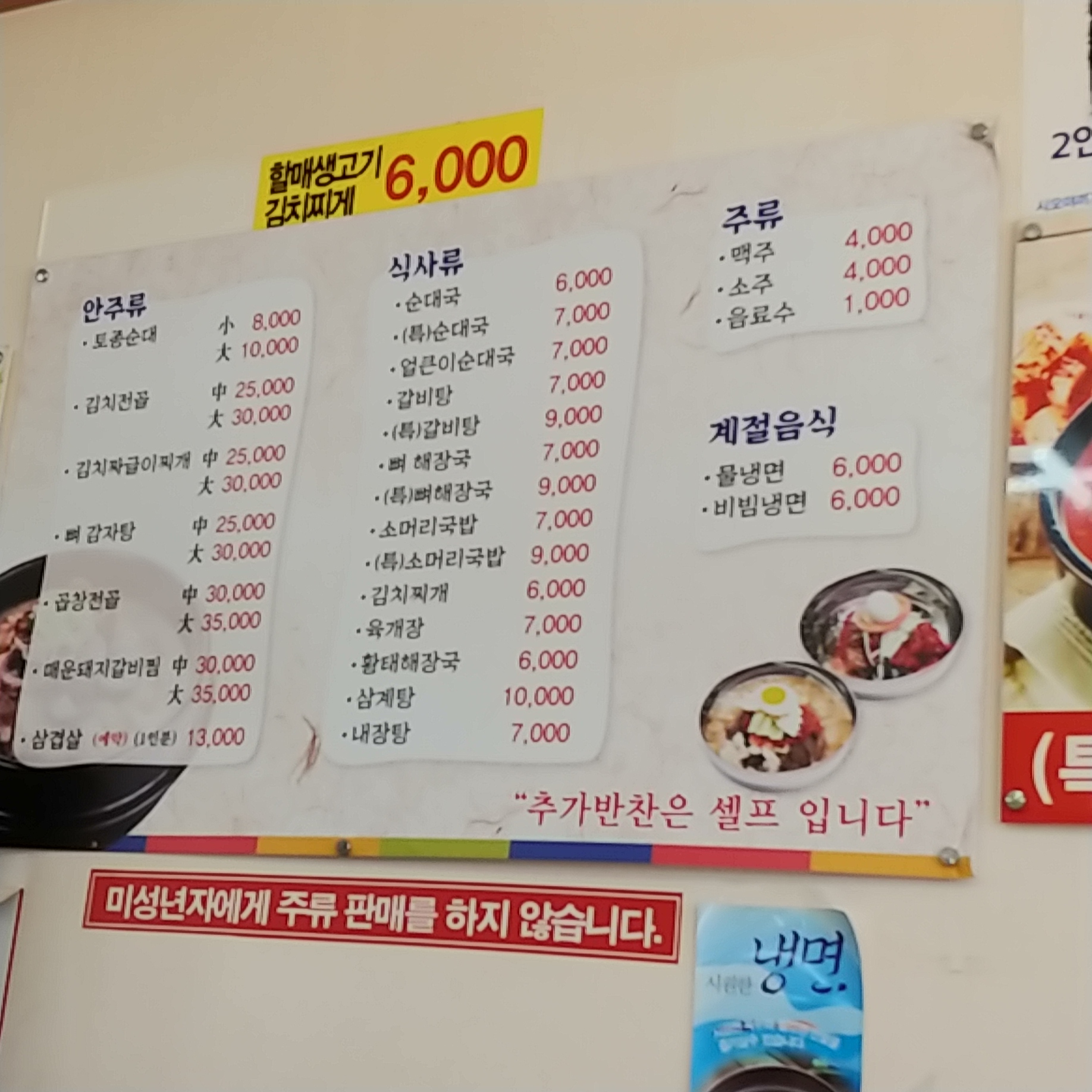 뼈해장국 김치찌개 내장탕에 물냉면까지