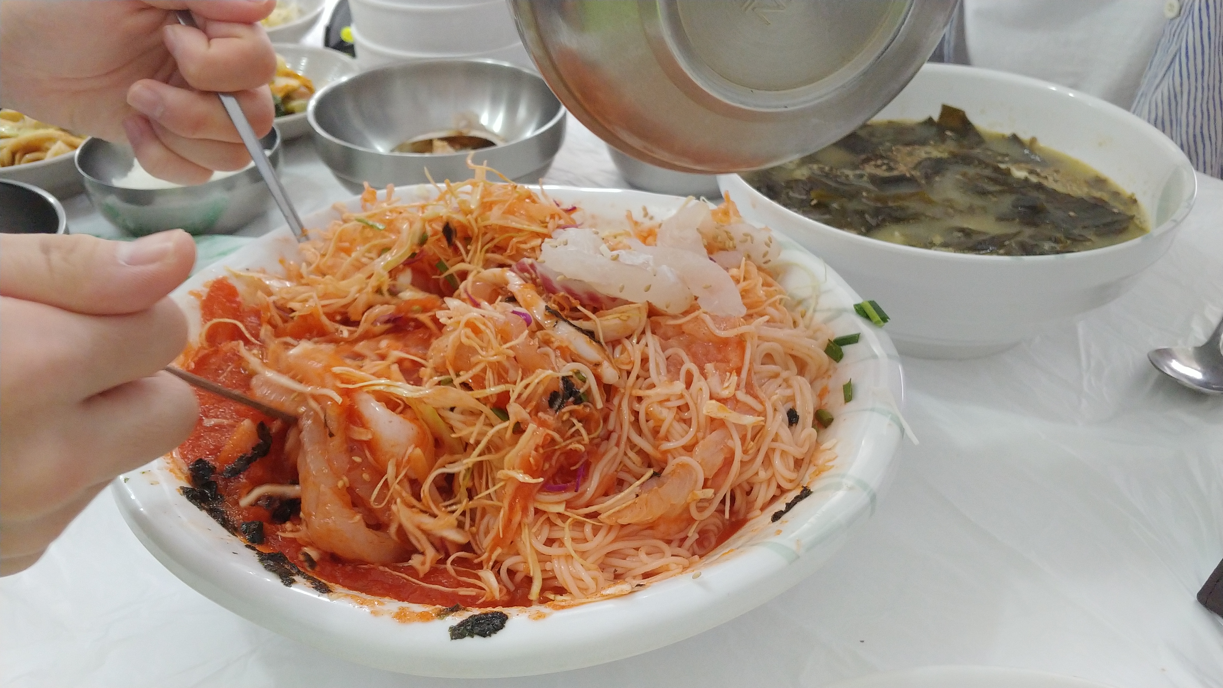 나와 아내와 중학생이 먹었는데 너무 많이 회도 남고 국물도 남아서 어쩔수없이 소면두개를 더 추가해서 비벼서 버무려서 말아서 먹었을정도이다.